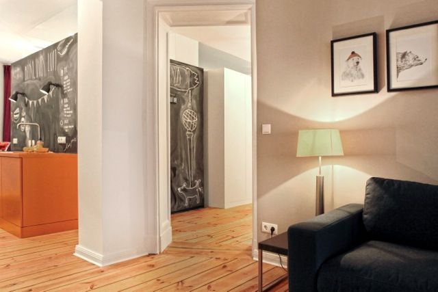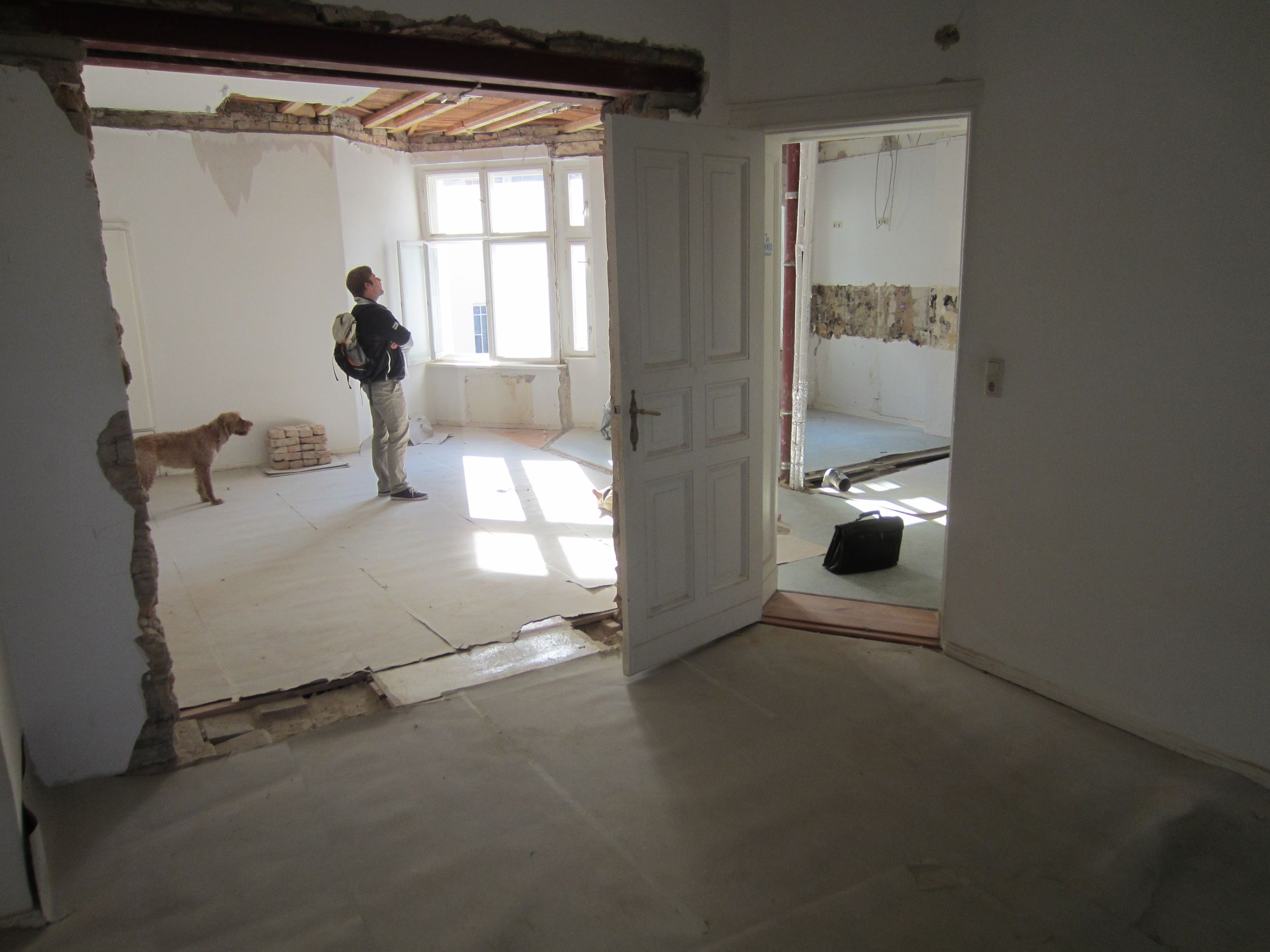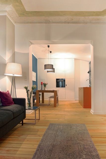 Bei diesem Projekt wurde der komplette Grundriss verändert und wir haben Fehlstellen im vorhandenen Fußboden mit historischen Dielen ergänzt. Die gesamte Wohnung wurde von uns geschliffen und mit einem oxidativen Öl imprägniert.