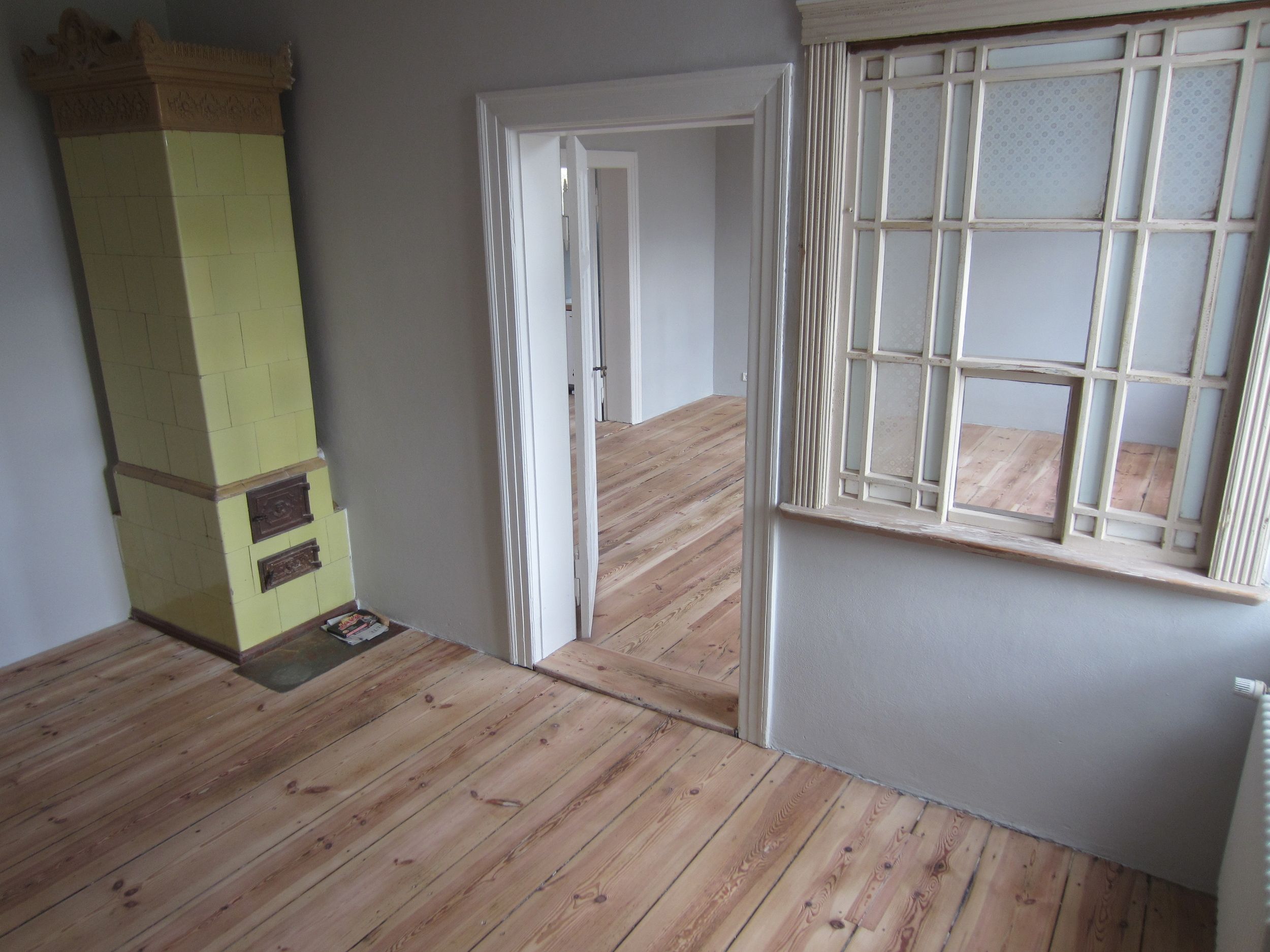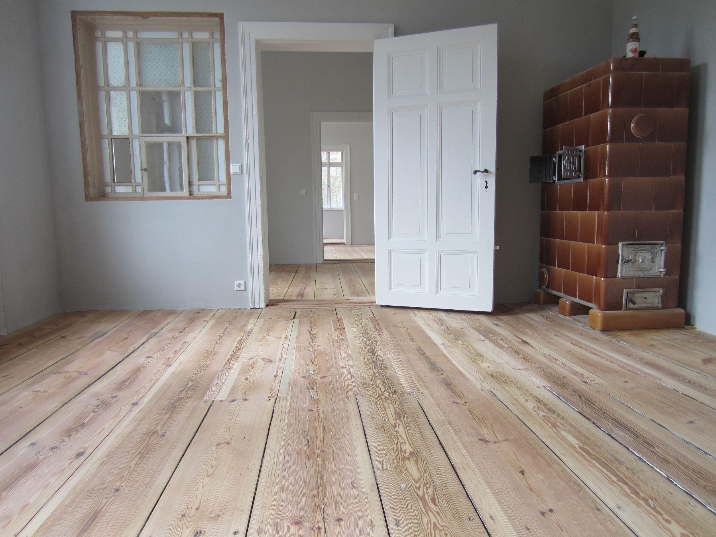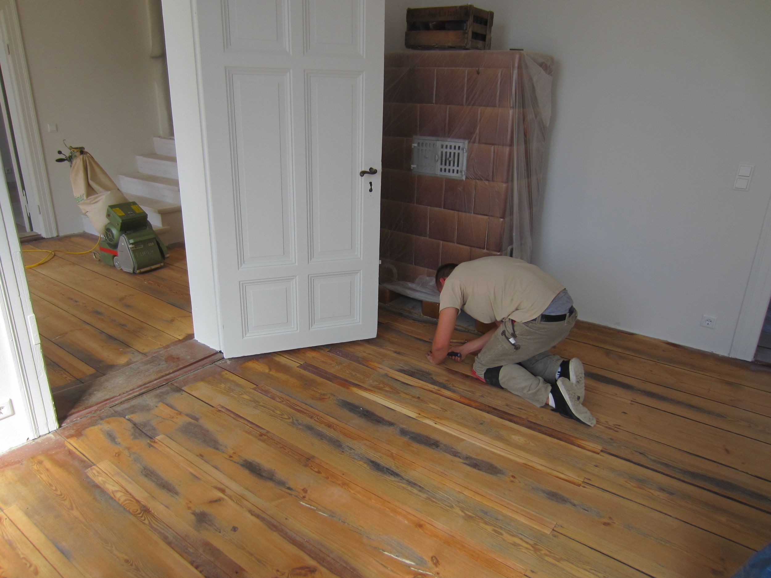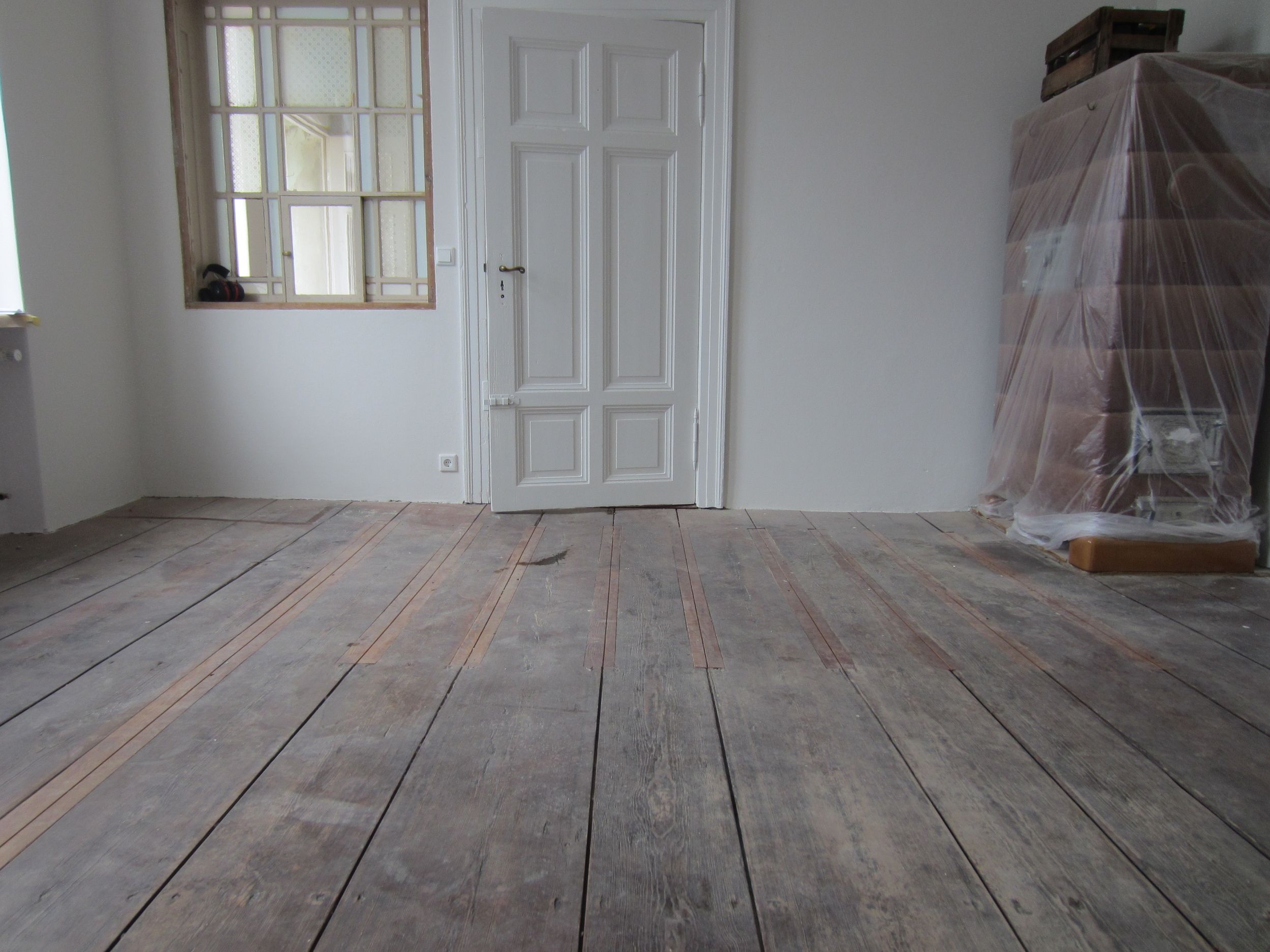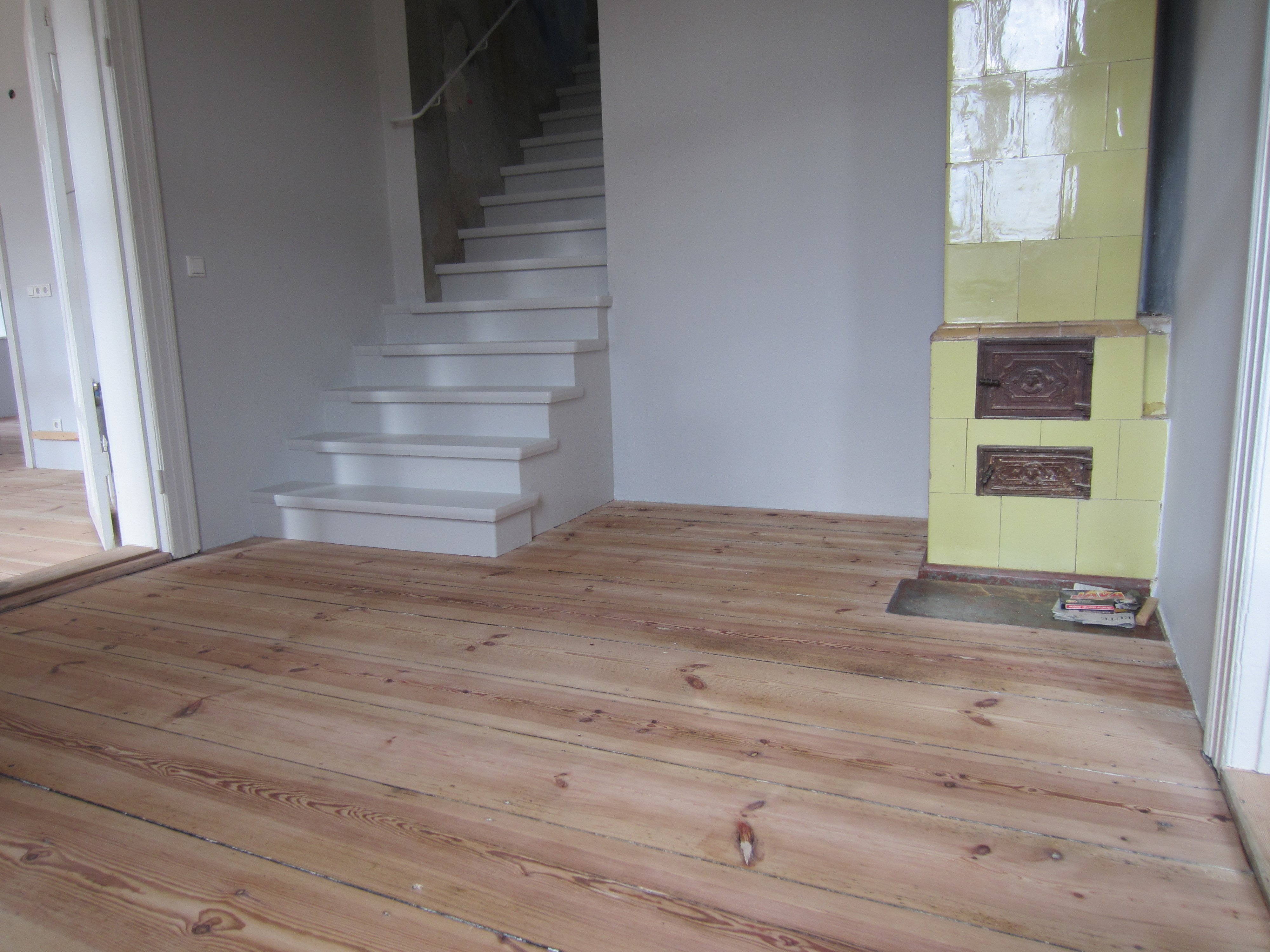 Bei diesem Projekt war der Wunsch der Bauherren, dass die extreme Topographie der ausgetretenen Dielen durch die Jahrzehnte langen Nutzung als Post erhalten bleiben sollte. Wir haben den Boden mit so wenig Materialabtrag wie möglich saniert und als Oberflächenbeschichtung WOCA Basisseife verwendet.
