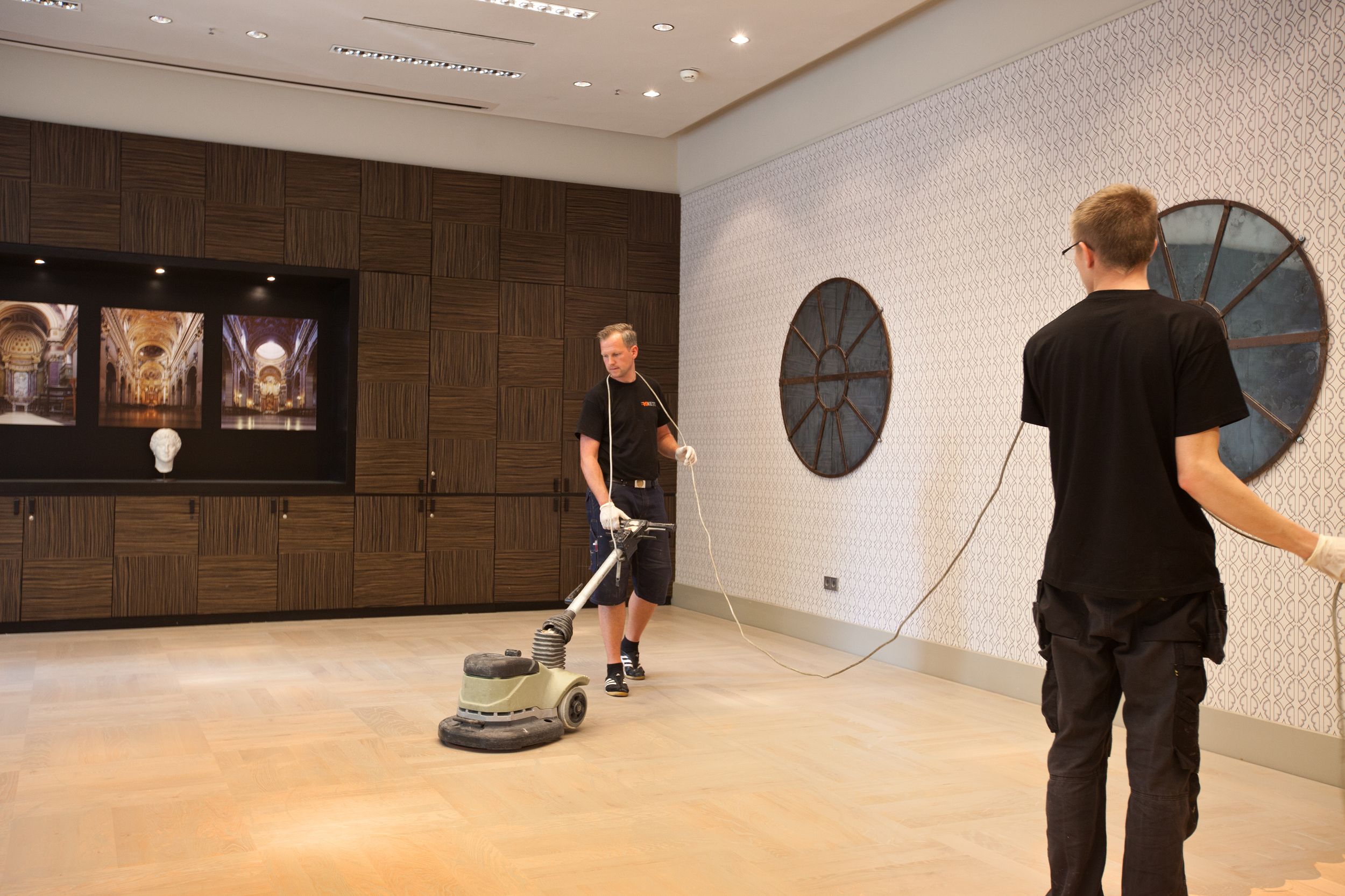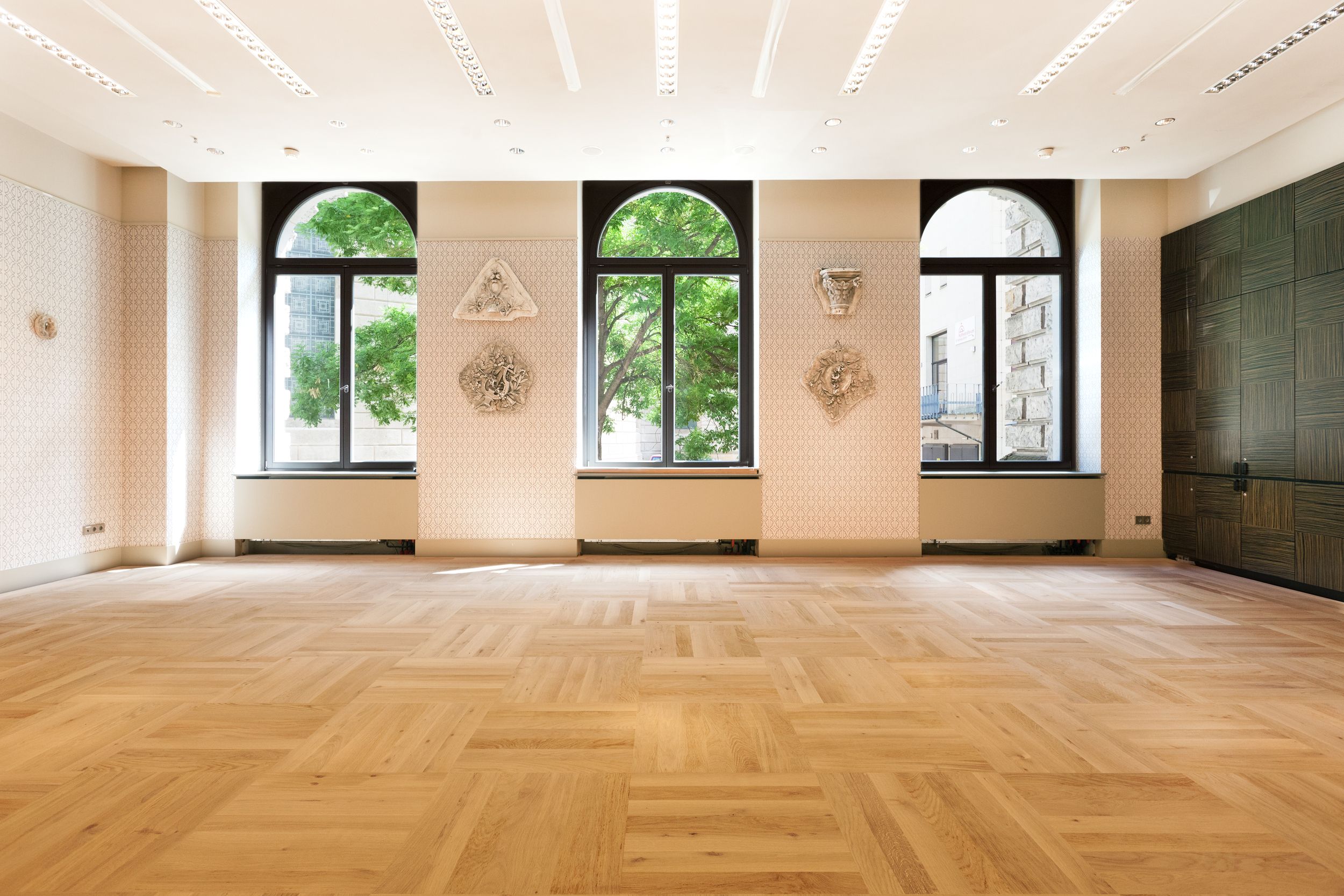In dem 5 Sterne Haus wurde von uns der ausgediente Teppichboden durch einen massiven Parkettboden ausgetauscht. Wir haben ein 22 mm starker Einzelstab als Sonderanfertigung im geraden Würfelmuster mit Fries verlegt. Herausforderung war für uns, dass anschließende Einfärben der geschliffenen Parkettfläche.