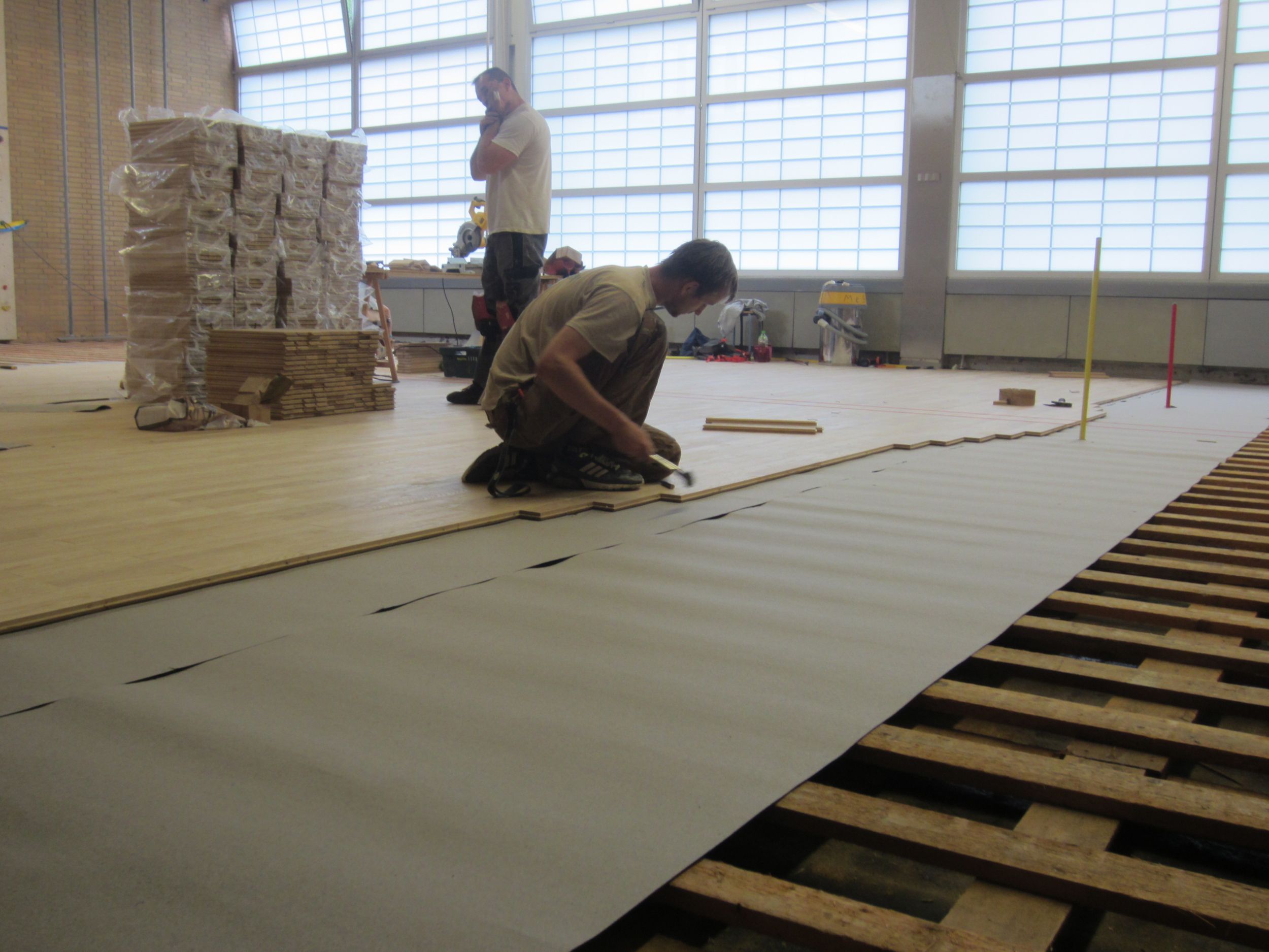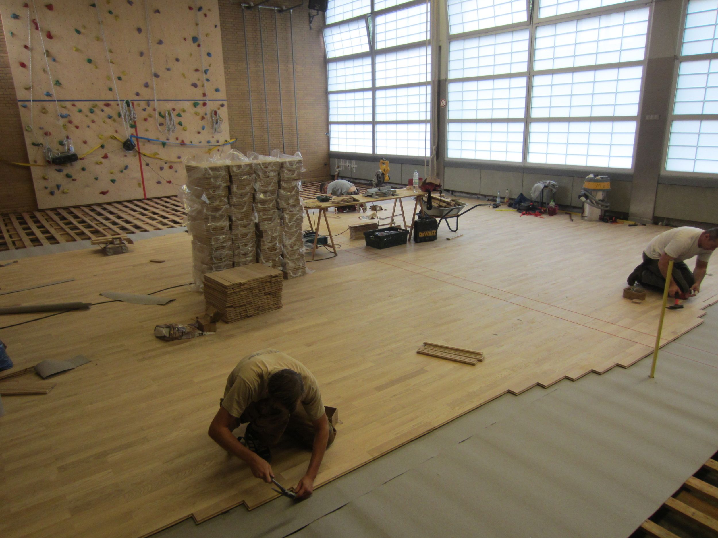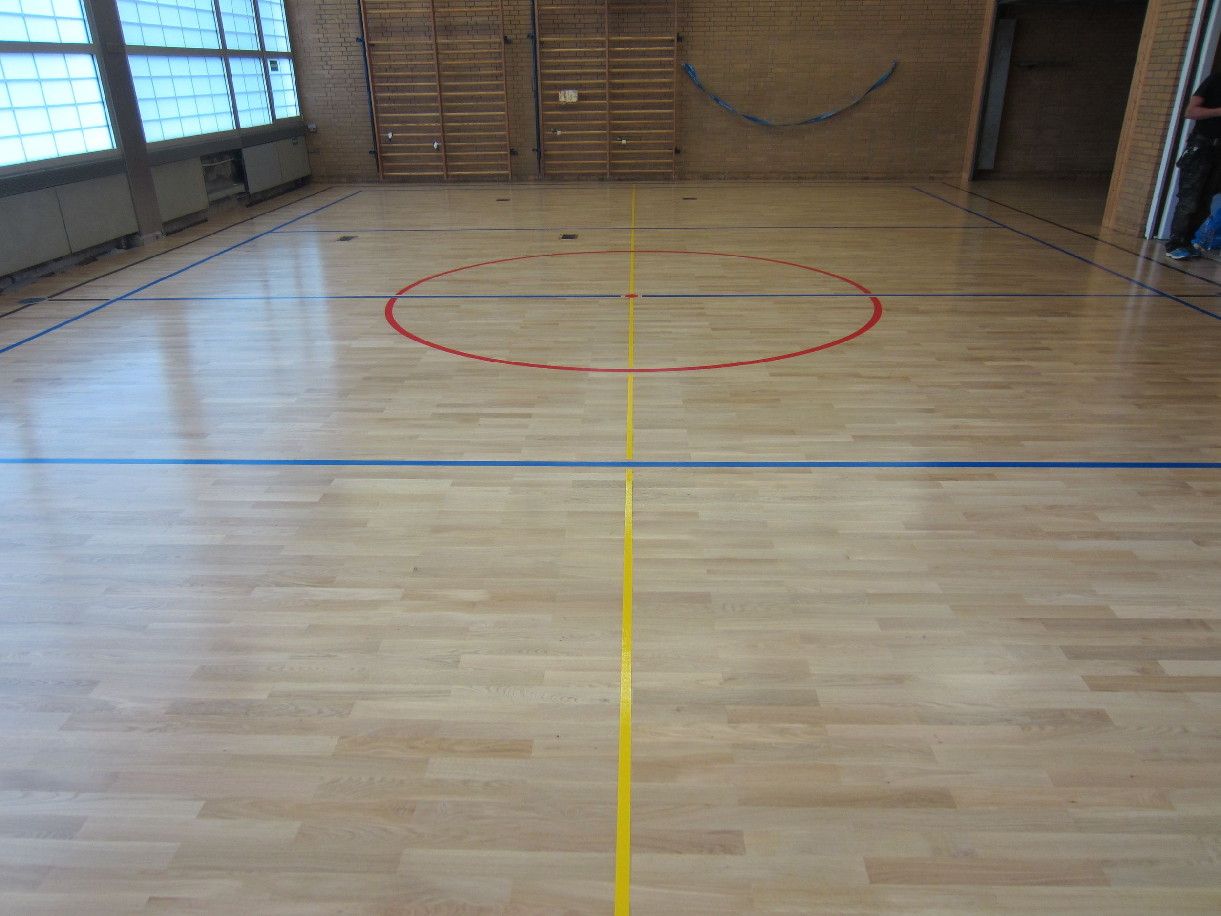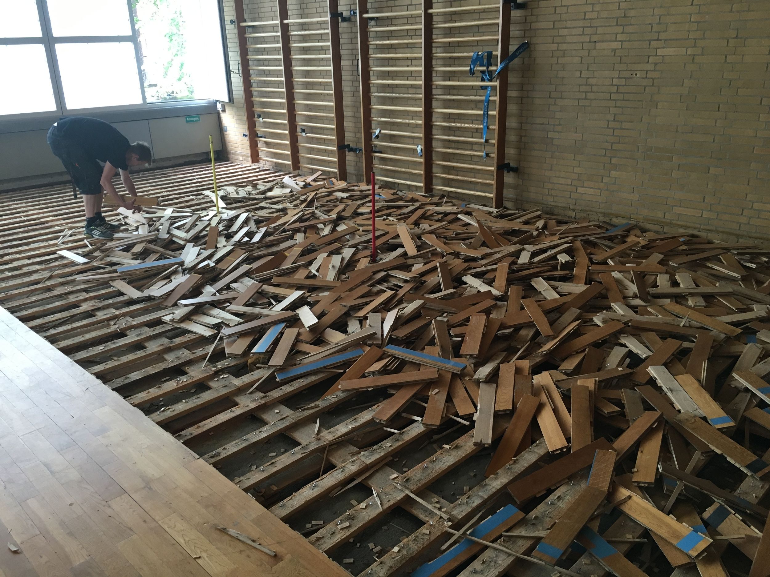 Bei diesem Projekt kamen wir zurück in die Zeit der klassischen Stabparkettverlegung mit Hammer und Nagel. Wir haben das alte genagelte Stabparkett aufgenommen den bestehenden Schwingboden partiell repariert und einen neuen Eiche Stabboden im regelmäßigen Verband genagelt verlegt. Als Oberflächenbehandlung wurde eine 2K-Sportbodenversiegelung von der Firma LOBA aufgebracht und die gewünschten Spielfeldlinien aufgezeichnet.